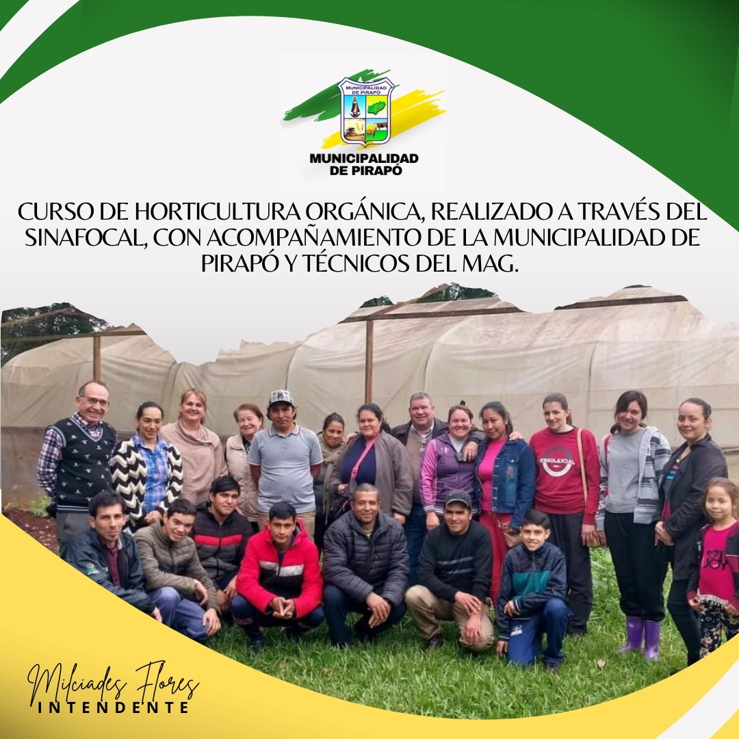 Educación Curso de Horticultura Orgánica El día 28 de junio del año 2024, se dio apertura del Curso de Horticultura Orgánica a través de SINAFOCAL y la Empresa RH GROUP, encabezado por la Municipalidad de Pirapó y la Junta Municipal.